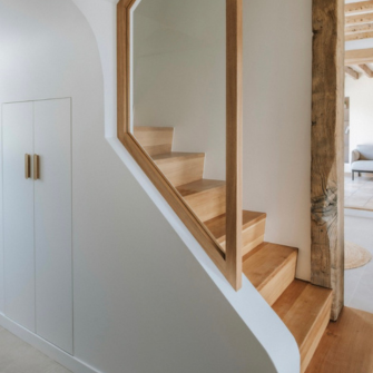 - Escalier droit : simple, épuré, il se marie parfaitement avec une verrière pleine hauteur.